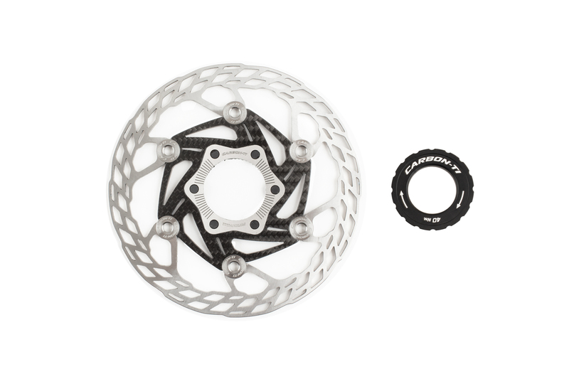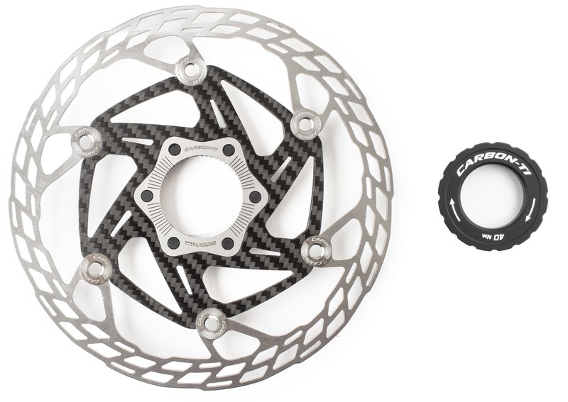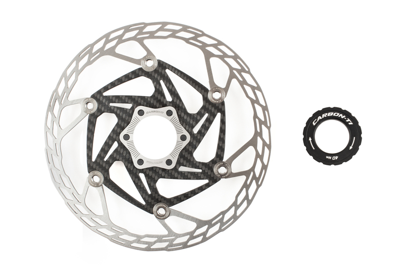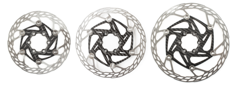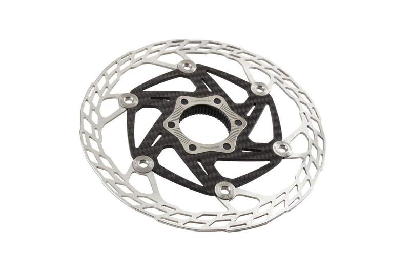 Disque de frein en acier avec étoile en Carbone, montage semi flottant 140, 160 et 180 mm. Fixation standard IS6 ou Center Lock.