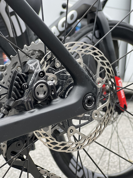 Utilisés en compétition par le Team UAE Team Emirates emmené par Tadej Pogačar, les disques Carbon-Ti X-Rotor SteelCarbon 3 sont une évolution du modèle X-Rotor SteelCarbon 2, qui a été largement salué par les passionnés de VTT et de route depuis ses débuts en 2015. Il est conçu pour se fixer sur les moyeux Center Lock ou IS6 en garantissant une fixation directe et efficace. Il s'agit d'un disque semi-flottant super léger avec une surface de freinage en acier, un corps intérieur en fibres de carbone, un adaptateur spécifique Al7075 Center Lock, une plaque de protection en titane gravée au laser et des rivets de fixation. Les disques présentent désormais un profil avec des bords arrondis usinés CNC, qui augmentent la sécurité et sont conformes aux réglementations de l'Union Cycliste Internationale (UCI). La piste en acier spécial de 1,8 mm d'épaisseur a été repensée pour améliorer les performances de freinage, améliorer la dissipation de la chaleur et permettre une usure plus uniforme des plaquettes. Les rivets et les rondelles sont en titane grade 5 et représentent une solution hautement technique, dans la lignée des versions précédentes, assurant une grande légèreté, résistance et fiabilité. La version Centerlock est équipée d'un contre-écrou à profil extrêmement bas, qui offre une large compatibilité avec les moyeux équipés d'axes traversants de 12, 15 ou 20 mm.