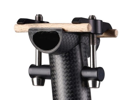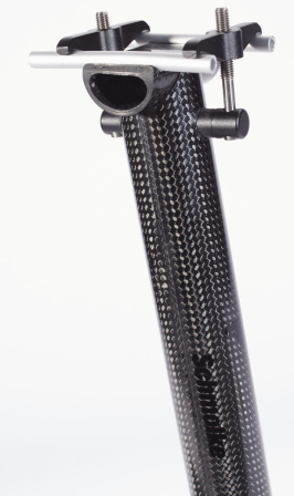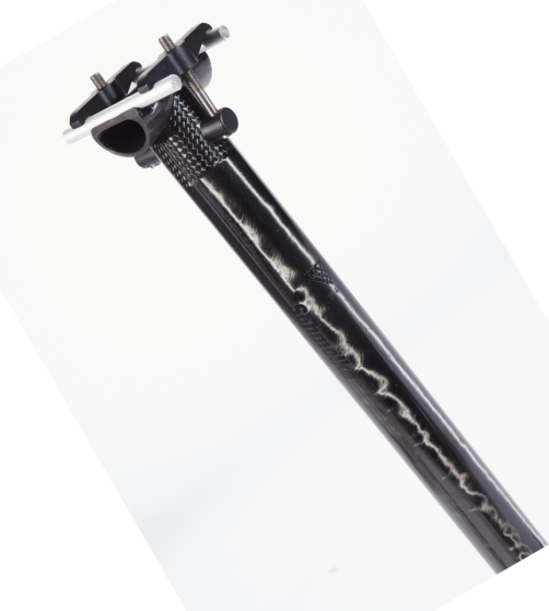 carbone et ses vis en titane Ti6Al4V de 6 mm sont compatible avec une utilisation VTT. Le tube de la tige de selle est à épaisseur variable avec un maximum de 19 couches de Carbone pré-imprégné