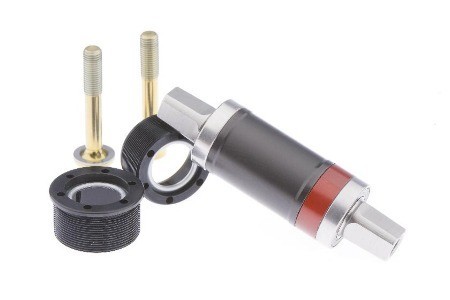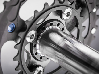 Axe en titane 6/4 pour manivelles à emmanchement carré, trois roulements annulaires, entretoise centrale en aluminium, vis en titane 6/4, filetages des vis de serrage des manivelles dans la
